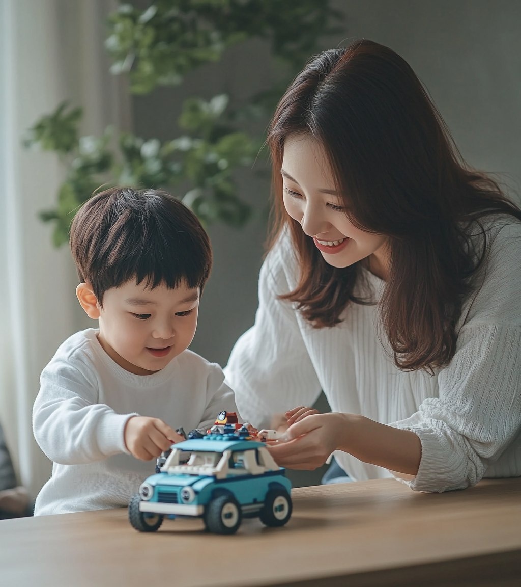 Создано на основе запроса: a hyper realistic photo of a korean mom and son playing with volkswagen beetle shaped LEGO. they are having fun