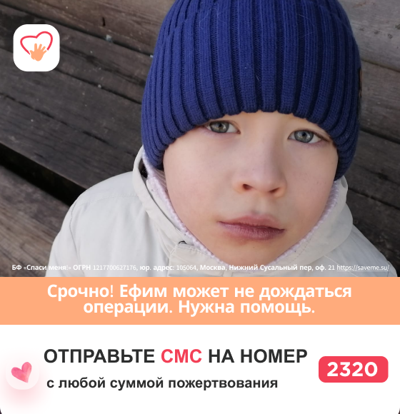 Недавний кризис едва не забрал Ефима у нас. Его состояние удалось стабилизировать, но это лишь короткая передышка перед новым ударом. С каждым приступом шансы Ефима тают. Время безжалостно отсчитывает последние дни, когда операция ещё может его спасти. Без Вашей помощи он просто не доживёт до того момента, когда врачи смогут ему помочь. Это не просто сбор, это гонка со временем за жизнь ребёнка. Помогите! ПОМОЧЬ ЕФИМУ МОЖНО ПО ССЫЛКЕ > Ефим изо дня в день ведёт неравный бой за жизнь. С самого рождения его преследует тяжёлый диагноз — синдром гипоплазии левых отделов сердца. Мальчик уже перенёс несколько операций, но болезнь не отступает.