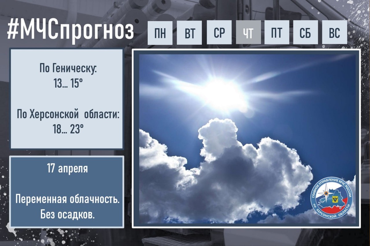 #МЧСпрогноз 🤝🤝 апреля в городе Геническ: переменная облачность. Без осадков. Ветер восточный и юго-восточный 7-12 м/с. Температура воздуха ночью 9...11°, днём 13...15°. По Херсонской области: переменная облачность. Без осадков. Ветер восточный и юго-восточный 7-12 м/с. Температура воздуха ночью 6...11°; днём 18...23°, в прибрежных районах 13…18°. ✅ Береги себя и своих близких. В случае происшествия звони по телефону «112»!