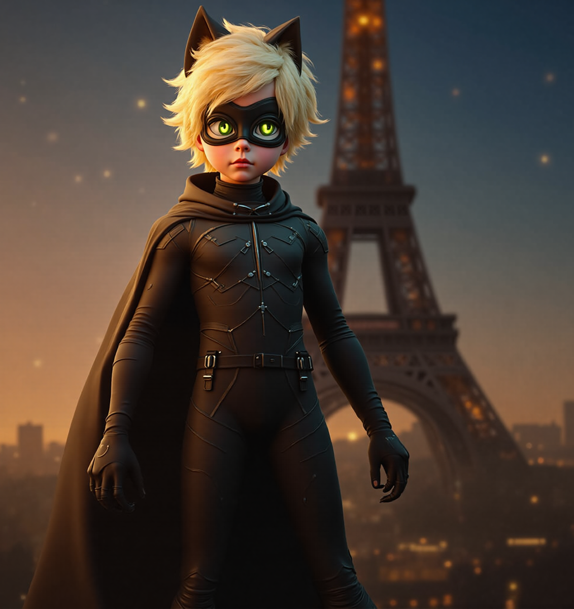 В одном волшебном городе, где круассаны умеют петь, а Эйфелева башня иногда подмигивает туристам, жил самый харизматичный супергерой на свете — Супер Кот. Его чёрный костюм блестел, как ночное небо, а посох сверкал, словно звезда. Правда, в тот день звёзды явно решили над ним подшутить… **Глава 1: Ловушка для хвоста** Услышав сигнал бедствия от Леди Баг, Кот гордо вытянулся на крыше: «Сегодня я спасу город первым!». Он прыгнул, лихо крутанул посохом… и зацепился им за фонарь. Повиснув вниз головой, он попытался сохранить достоинство: «Э-это новая тактика! Растянуть злодея смехом!». Леди Баг, пролетая мимо, фыркнула: «Может, сначала снимешься с фонаря?». **Глава 2: Супер-пупер лассо** На площади злодей Тьмяный Бульдозер крушил всё вокруг. «Время сиять!» — крикнул Кот, запуская посох-лассо. Но вместо того чтобы обвить врага, верёвка схватила… уличного музыканта с аккордеоном. Тот заиграл драматическую мелодию, а Бульдозер, растроганный, заплакал и сдался. «Вот видишь, мой план сра