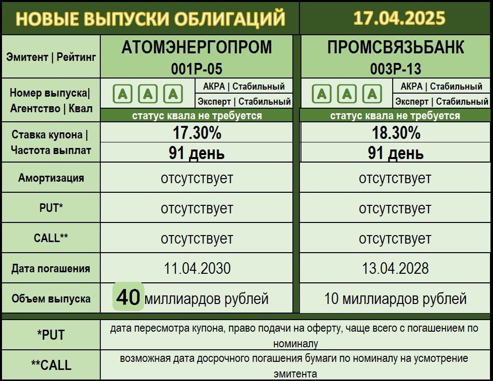 🥳 А вот и четверг подкрался, друзья, доброе утро! У меня сегодня день особенно интересный получается, но об этом, пожалуй, в конце :) Сначала обрадую любителей длинной надежности - начнется пост с бумаг именно из этой корзинки. А на первичке уж что есть 😃 ✅ Два выпуска начнут сегодня свой долгий биржевой путь, вот какие подарки :) 〰️〰️〰️〰️〰️〰️〰️〰️〰️〰️ 🟢 ПРОМСВЯЗЬБАНК 003Р-13 📊 🅰️🅰️🅰️ ➖ https://raexpert.ru/releases/2024/dec05i (05.12.2024) ➖ https://www.acra-ratings.ru/press-releases/5117/ (27.09.2024) 🔹 ISIN: $RU000A10BFF4 ▪️ Купон фиксированный: 18,3% ▪️ PUT/CALL: отсутствуют ▪️ До погашения: 3 года ➤ Главная интрига - появятся ли предложения на продажу в стакане вообще. А ведь совсем не факт - сбор прошел во вторник без привлечения широкой аудитории. Поэтому и распыляться особо не буду - любители надежной длины люди опытные, моих умозаключений тут явно не требуется :) 〰️〰️〰️〰️〰️〰️〰️〰️〰️〰️ 🟢 АТОМЭНЕРГОПРОМ 001Р-05 📊 🅰️🅰️🅰️ ➖ https://raexpert.ru/releases/2024/sep19 (19.09.