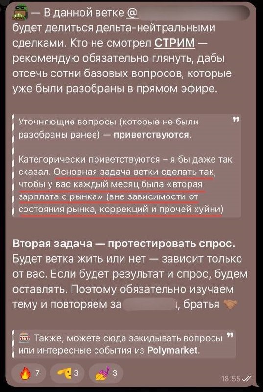 В конце предыдущего месяца была открыта новая тема, посвященная работе с платформой «Полимаркет» и дельта-нейтральными стратегиями. Для тех, кто не знаком с этим термином: дельта-нейтральные сделки — это финансовые операции, при которых не учитывается прогнозируемое направление движения рынка. Прибыль формируется вне зависимости от изменений рыночных условий и направления цены актива. Цель этой темы — предоставить участникам возможность получать стабильный доход от торговых операций на рынке, вне зависимости от текущей ситуации и внешних факторов. В ветке регулярно публикуются материалы и обсуждения, посвященные арбитражным стратегиям в контексте фандинга, которые позволяют получать дополнительный доход в размере от 50 до 300 долларов США. Хотя эта сумма может показаться небольшой, она демонстрирует, как можно регулярно увеличивать капитал, предпринимая стратегически обоснованные действия. |PRIVATE|