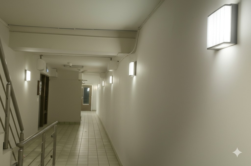 В лестничных клетках важно соблюдать баланс между достаточным уровнем освещения и экономичностью. Обычно применяют светильники мощностью 12-18 Вт, размещая их через каждые 3-4 метра. При этом рекомендуется использовать устройства с возможностью регулировки яркости для оптимизации энергопотребления в ночное время.