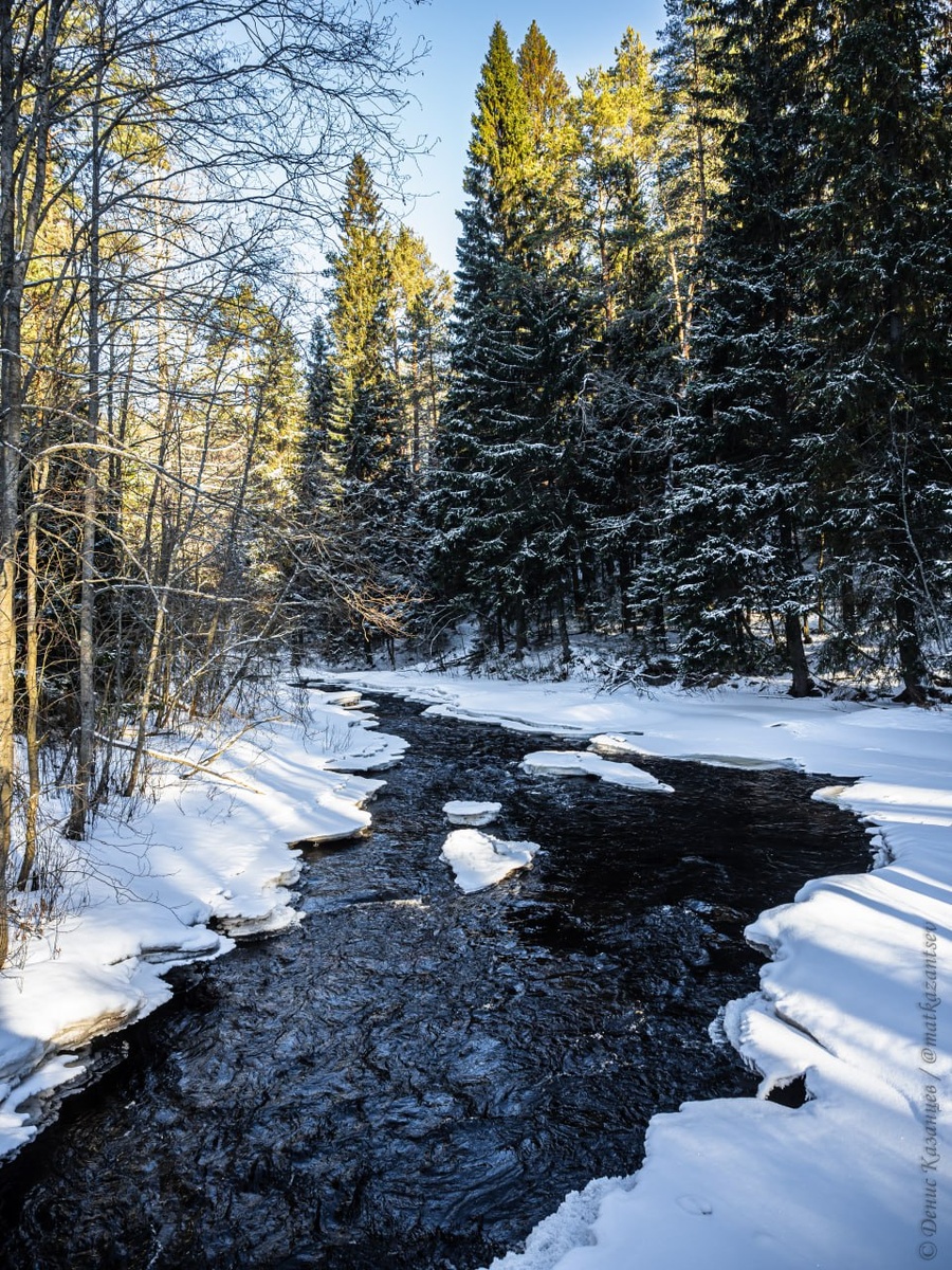 Водопад «Порог Нижний Койриноя» находится недалеко от города Питкяранта. Мы заехали по пути из Сортавалы в Петрозаводск. Это отличное место для неспешных прогулок среди соснового леса. Подъезд удобен: рядом проходит хорошая трасса, а небольшой съезд ведёт прямо к началу тропы. К слову, Яндекс говорит, что в холодное время года водопад полностью замерзает, но в этот раз зима была теплой, и мы даже полюбовались открытой (местами) водой. Про теплую зиму ещё поговорим позже, в контексте Кижей и воздушных подушек. На территории водопада установлены мостки, которые позволяют безопасно наслаждаться красотой места с разных ракурсов. Что касается безопасности — я сам красиво упал вместе с камерой, но всё дело в скользкой обуви :) Забегая вперёд и отвечая на возможные вопросы, скажу, что в Рускеалу мы не ездили по двум причинам: - Детские каникулы. - Место показалось мне слишком заезжено туристами, и там особо нечего смотреть, с точки зрения съемки зимой. Поэтому фотографий оттуда не будет в