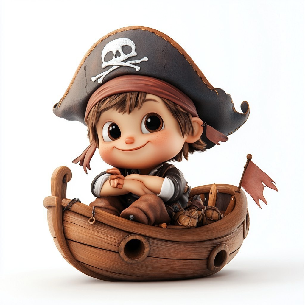 Создано на основе запроса: a cute kid dressed up as a pirate, sitting in small pirate ship, hand drawn 3d render drawing, on white