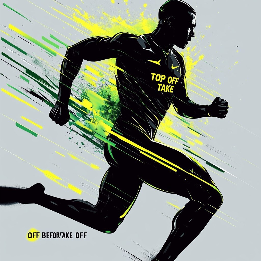 Создано на основе запроса: a dynamic silhouette of a European male sprinter in motion, lean and athletic build, with energy bursts and motion lines radiating from the core, a sports energy product (like Gatorade chews) embedded in the chest area, bright green and yellow streaks illustrating power and speed, bold text saying "TOP OFF BEFORE TAKE OFF", futuristic and energetic style, sports advertisement look, dramatic lighting, high contrast, grey background