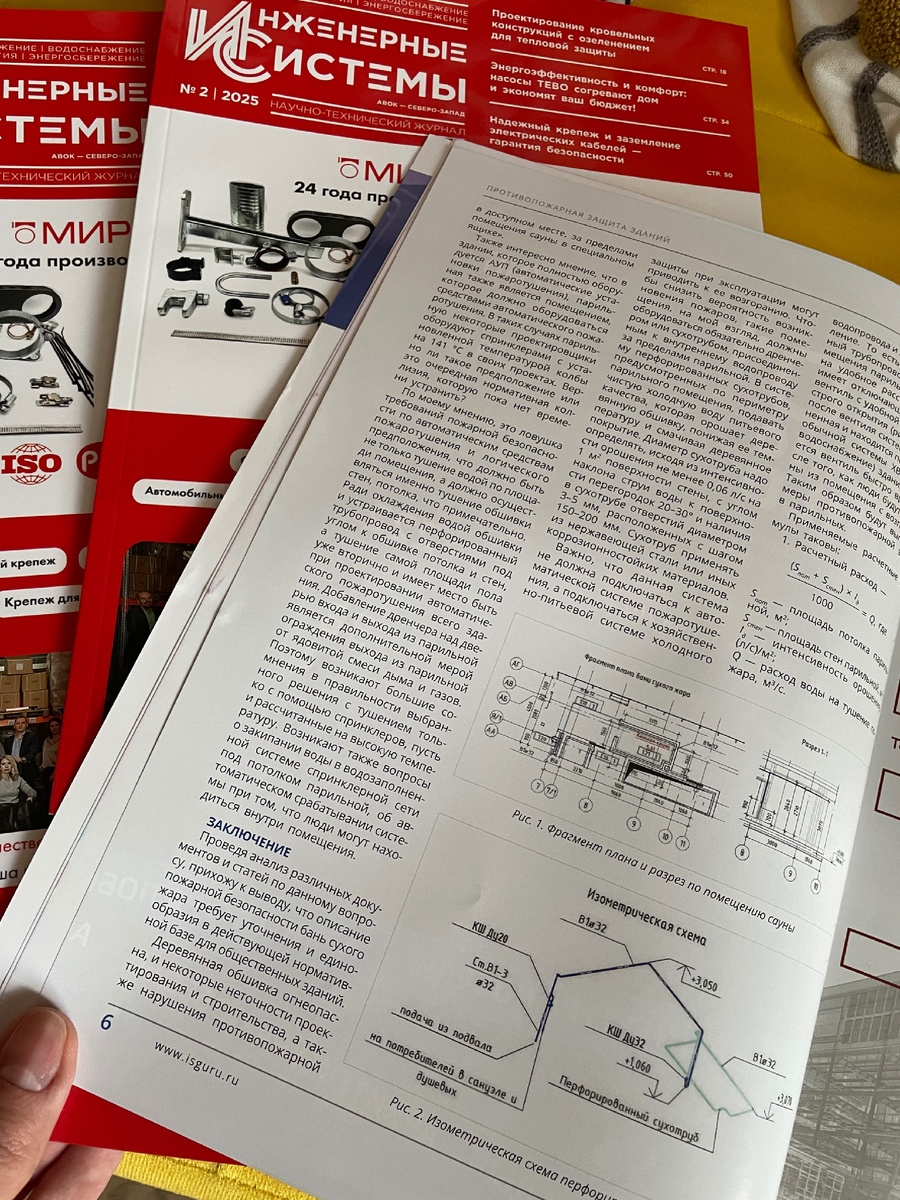 Дорогие коллеги и интересующиеся темой пожаротушения и водоснабжения в общественных зданиях. По старой доброй традиции выпущена новая статья на тему-размышления по поводу обеспечения пожарной безопасности в зданиях, где имеются бани сухого жара, так называемые парильные. И вот наконец-то 13 апреля 2025 г. я получила на руки немного экземпляров этого замечательного журнала с материалами статьи, которую собирали несколько месяцев. Хотелось бы обратить внимание, что у журнала есть свой сайт http://www.isjournal.ru/ и архив журналов, в формате .pdf. Внимательные читатели моего блога, в курсе о ранее выпущенных мной статьях в этот же журнал. Такие как: В статье рассматривается традиция проектирования сухотрубов в банях, мои личные размышления как предусматривать, каким образом считать орошение стен и потолка обшивки парильной, привожу свой пример с реального объекта с расчетами и возможными нюансами подключения к системам водоснабжения. А также привожу некоторые рекомендации по дальнейшей