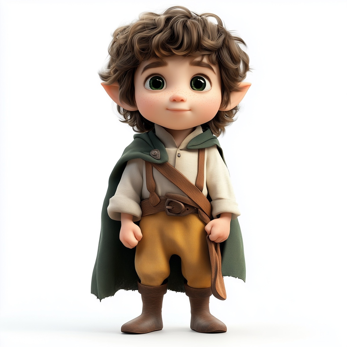 Автоперевод: Милый ребенок, одетый как фродо Бэггинс, белый из «Властелин колец», рисунок с 3D -рендерингом, на белом фоне