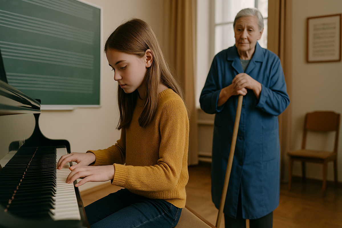 Когда на концерте подошла очередь Богданы, она вышла и села за фортепиано. На мгновение пальцы дрогнули: в зале сидело множество народу, на нее смотрели учителя, друзья, одноклассники и мама… Краем глаза Богдана заметила, что у входа присела на стул женщина в синем халате. Валентина Ивановна пообещала, что постарается прийти, - и сдержала слово.