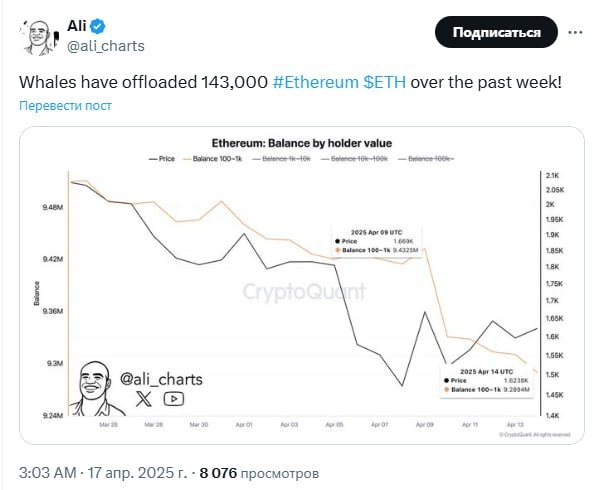 Киты сбросили 143 000 ETH за последнюю неделю!