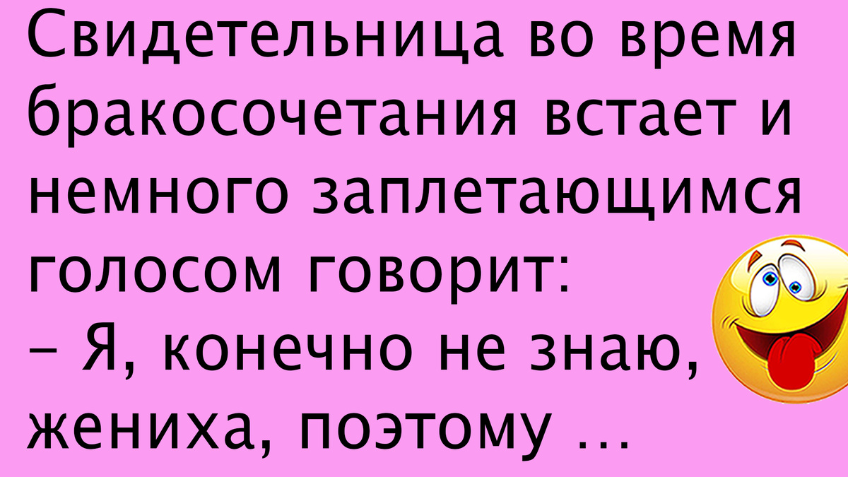 Когда мужчина и женщина начинают жить вместе начинается новый этап их отношений – необычный веселый, курьезный и … иногда недолгий. И, главное, в этот всегда поддерживать хорошее настроение. А начинается всё еще в ЗАГСе. Если кто не знает, это то место, где будущие муж и жена подписывают контракт на их совместную жизнедеятельность. И иногда на этом мероприятии присутствуют свидетели и свидетельницы. Возможно для того, чтобы зафиксировать это знаменательное событие, а возможно, для того, чтобы просто гульнуть хорошенько нахаляву. Но коль они есть их иногда чё-то там спрашивают. Итак, во время бракосочетания с трудом со стула приподнимается свидетельница и заплетающимся голосом вещает: - Я, конечно дико извиняюсь, но к величайшему сожалению я плохо знаю жениха … нет, вообще не знаю. И поэтому … Она сделал небольшую паузу, икнула и продолжила: - я скорее всего не смогу поздравить невесту с этим выбором и с этим событием. Но …, Она многозначительно подняла палец вверх, посмотрела не него.