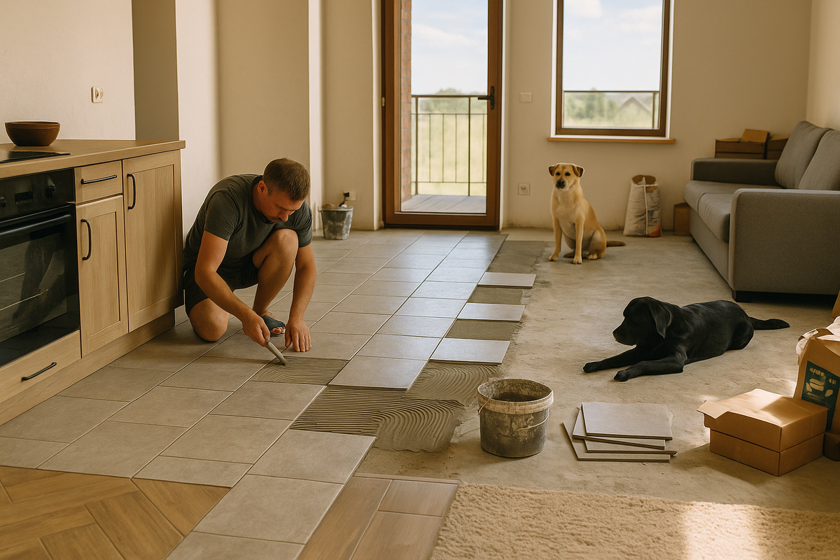 Есть дома, где живут с чувством завершённости. У нас — с чувством «почти доделали». Полтора года назад мы въехали в новый дом, который мой муж построил своими руками. И с тех пор у нас идёт великая стройка под кодовым названием «ну, это не срочно». Кухня у нас совмещена с гостиной. В кухне уже давно — красивая плитка. А в гостиной год лежала фанера, сверху ковер, и все как-то смирились. Но недавно настал исторический момент: фанеру убрали, ковер скатали, и мой муж начал укладывать керамогранит в гостиной. Внимание, вопрос: сколько женщин в этом доме радостно прыгают по новым плиткам, обходя свежезамазанные швы? Ответ: одна, и она сейчас пишет этот текст. Но главный герой нашего списка «вот-вот сделаем» — это балкон. Мы уже год мечтаем поставить на него ограждение. Потому что у нас две собаки, и идея открытого балкона немного пугает. Айрис ещё ладно, она благоразумна. А вот Брюс — старенький, не всегда ориентируется, может шагнуть не туда. Поэтому дверь на балкон открывается у нас строг