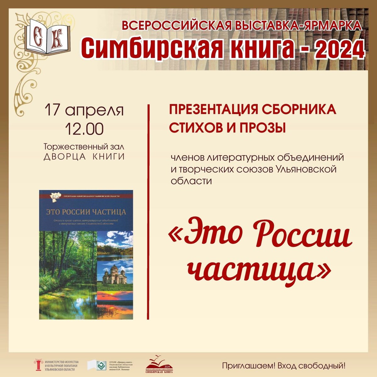 Симбирская книга, что нас ждёт СЕГОДНЯ, рассказываем! Всероссийская выставка-ярмарка и XXII региональная выставка-конкурс «Симбирская книга-2024» продолжается! 💥17 апреля в 12.00 пройдёт презентация антологии стихов и прозы членов литературных объединений и творческих союзов Ульяновской области «Это России частица» 🏵17 апреля в 16.00 состоится встреча с писателем и поэтом Галой Узрютовой, с участием художника, иллюстратора Юлии Узрютовой. Автор представит свои новые книги «Выбор воды» и «Я с вами не разговариваю, или Страна Женя». Напомним: 🏆18 апреля в 15.00 Торжественная церемония закрытия и подведение итогов конкурса, будут определены победители в 14 номинациях, главная из которых «Книга года». Также до 17 апреля открыто интернет голосование на сайте Дворца книги clck.ru/3JiraE, по результатам которого будет определён победитель в номинации «Выбор читателя». 📚Продолжается акция «Книги СВОим» . Как принять участие в акции? Очень просто! До18 апреля все желающие могут принести