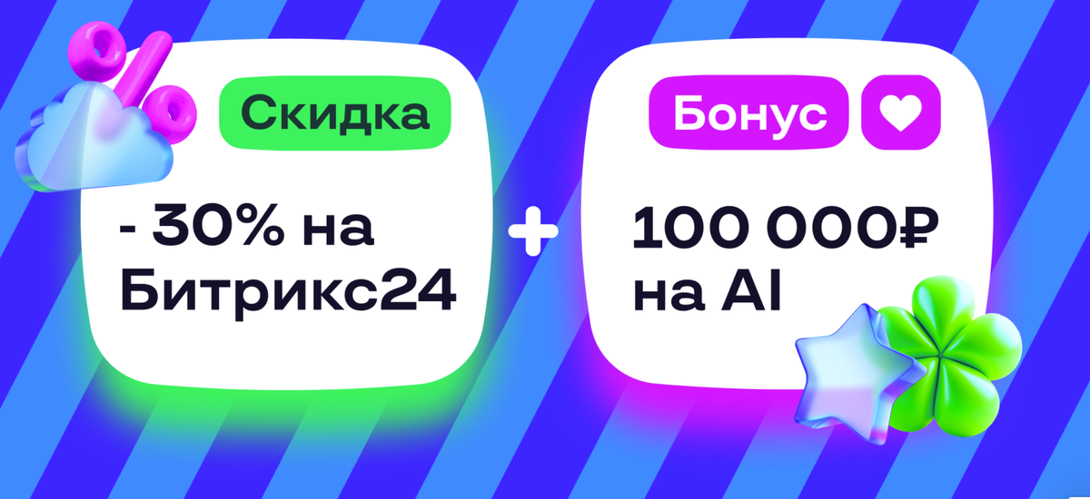 Только до 30 апреля вы можете воспользоваться специальной скидкой 30% на все тарифные планы Битрикс24. В дополнение к этому, вы получите 100 000 ₽ на использование AI-помощника CoPilot — инновационного инструмента, который способен существенно улучшить взаимодействие с вашими клиентами.
