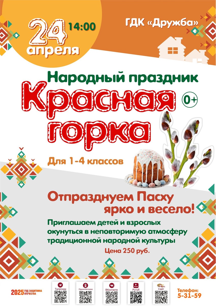 Друзья! Народный фольклорный ансамбль «Родники» приглашает учащихся 1-4 классов, а также их родителей и классных руководителей на Народный праздник «КРАСНАЯ ГОРКА» 24 апреля в 14 часов. 💯 Отпразднуем Пасху ярко и весело! Вы окунетесь в неповторимую атмосферу традиционной народной культуры! В программе: ☀️ Пасхальные игры и песни, танцы и хороводы! 🎼 Живое звучание народных инструментов! Вы не просто будете зрителями, а станете участниками удивительного действа, которое погрузит вас в мир старинных обычаев и обрядов! 🔆 Наш праздник – это путешествие в богатейший мир традиций наших предков! Цена билета 250 руб. Касса: 5-31-59.