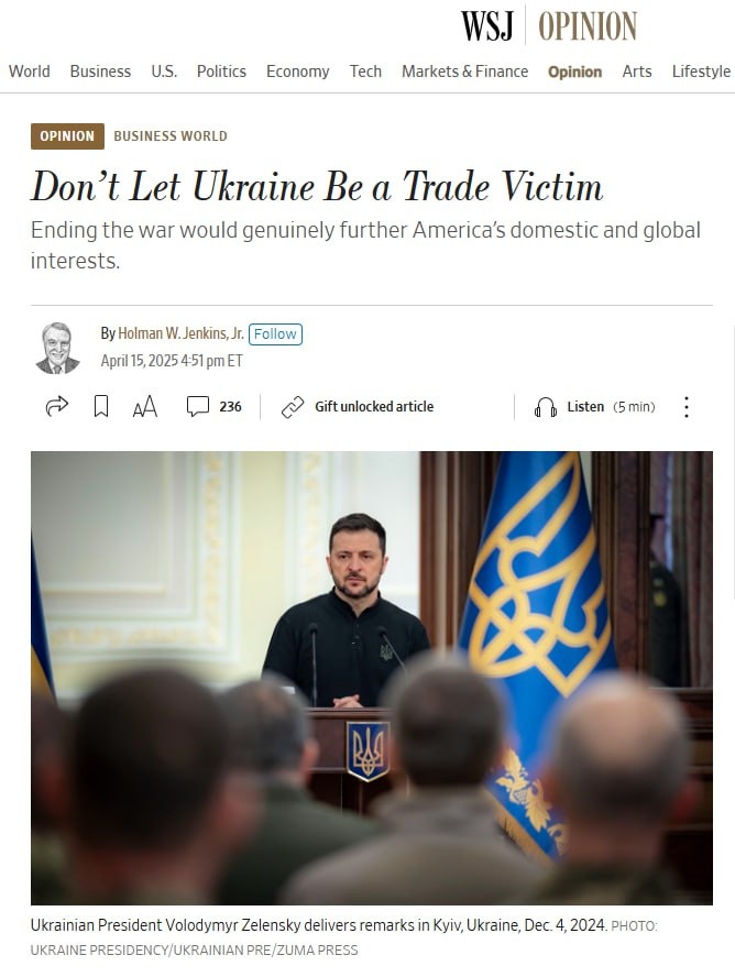 «Не дайте Украине стать жертвой торговли» – призывает член редакционной коллегии The Wall Street Journal Гольман Дженкинс-младший в авторской колонке для этого издания. И он же утверждает, что «Завершение войны действительно соответствует внутренним и глобальным интересам Америки». «Американцы сочувствуют Украине — и правильно делают. Но Джо Байден дал ясно понять: интересы США не подразумевают прямого участия в боевых действиях. Не озвученное напрямую, но очевидное следствие этого посыла: США готовы позволить Украине проиграть», – говорится в публикации. «Американцам стоит задаться неудобным вопросом: что думает руководство Украины по этому поводу сейчас, когда переговоры уже на столе?», – продолжает автор и напоминает, что первая попытка импичмента Трампа в 2019 году начался с обвинений демократов во взяточничестве и вымогательстве — якобы он требовал от Украины политических услуг в обмен на американское оружие. Однако всё закончилось другим — сотрудники Госдепартамента намекали, чт