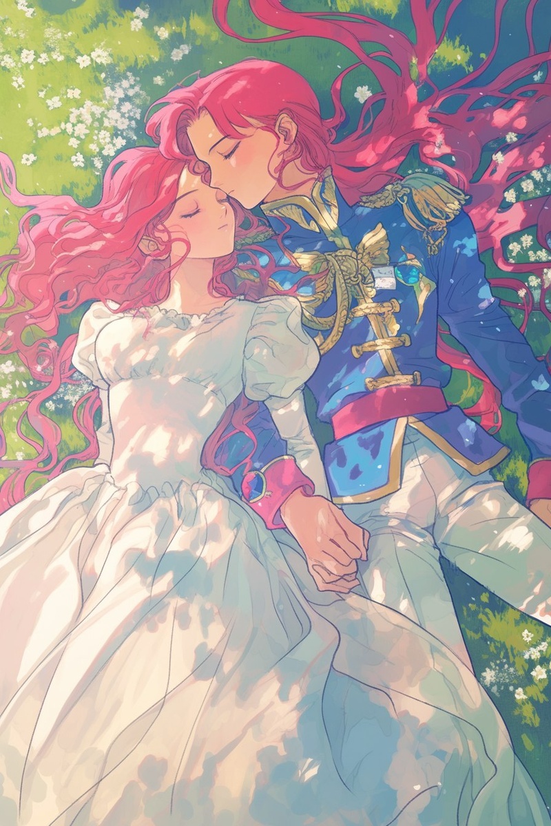 Создано на основе запроса: Juliet with red flowing hair and she wears a long white empress dress, with Romeo in a blue and red old outfit, in style of simple anime, pastel, anime tv cinematic intro, wide shot, lots of emotion, lots of greenery, simple to no shading, Yoshiaki Yoshiaki Kawajiri
