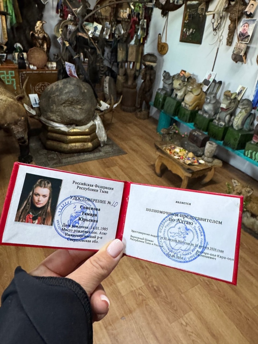 На удостоверении, фото которого опубликовала Халы, действительно заметна печать верховного шамана Тувы Кара-Оола Допчун-Оола. По данным сервиса «Контур. Фокус», он возглавляет «Централизованную религиозную шаманскую организацию Тувы „Управление верховного шамана“», а также кызылскую организацию шаманов «Адыг-Ээрен (Дух Медведя)».