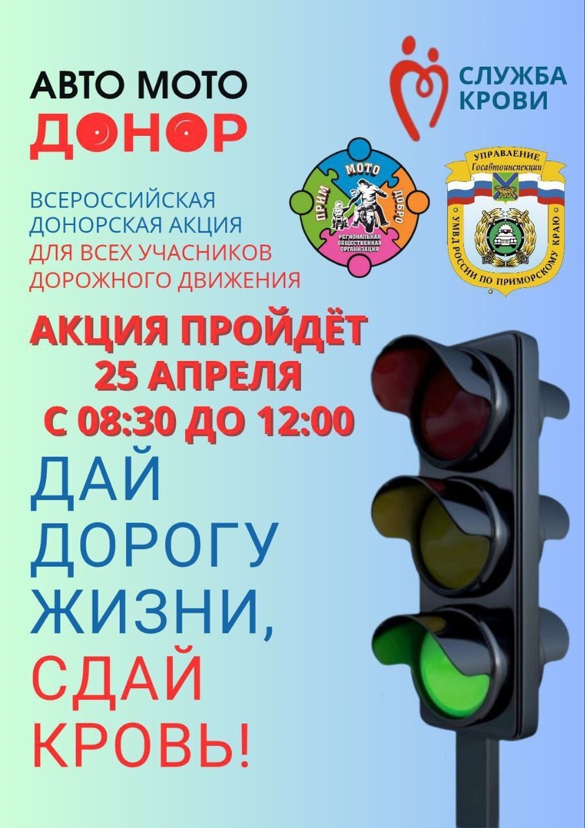 🔁 Дальняк.рф™: Жителей Приморского края приглашают принять участие в акции по сдаче донорской крови 25 апреля, в преддверии официального открытия мотосезона, Приморская краевая станция переливания крови совместно с Госавтоинспекцией и региональной общественной организацией мотолюбителей Приморского края «Прим Мото Добро» проведут акцию «Авто-Мото-Донор». Задача организаторов акции - привлечь внимание общества к тяжести последствий происшествий с участием двухколесного транспорта, призвать к уважению, соблюдению правил и культуры дорожного движения. Мероприятие пройдёт 25 апреля с 08.30 до 12.00 на Краевой станции переливания крови по адресу: город Владивосток, улица Октябрьская, дом 6 (остановка общественного транспорта «Покровский парк»), а также в филиалах «КСПК» в городах: Арсеньев, улица Ломоносова, дом 11; Дальнегорск, проспект 50 лет Октября, дом 102/1; Находка, улица Пирогова, дом 3; Лесозаводск, улица 9-го января, дом 102; Уссурийск, улица Некрасова, дом 119 Подробная информ