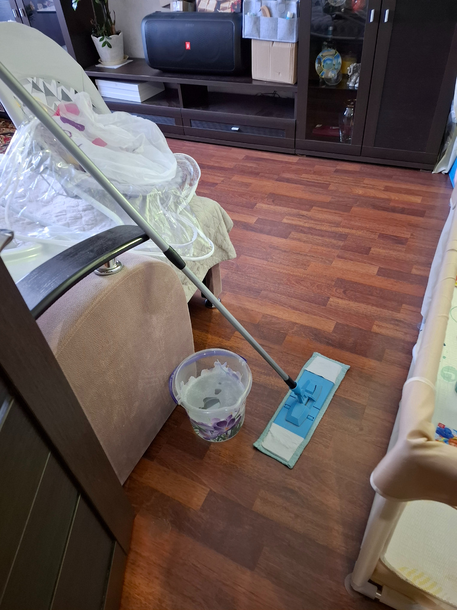 Сегодня Тёма был в настроении и я решила, что можно помыть полы. Запустила Лёлика, он мне всё пропылесосил. Когда ездил на кухне пылесосил я уже пошла намывать пол в зале.