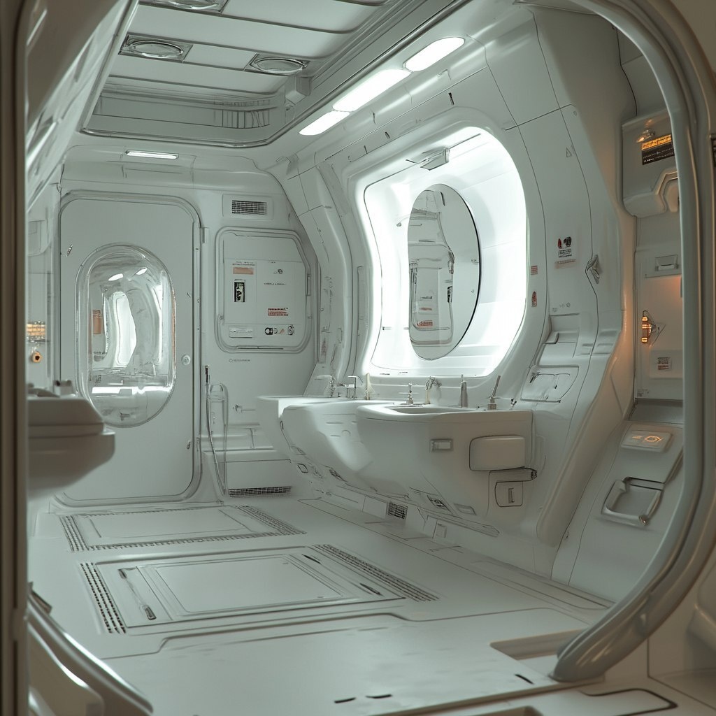 Создано на основе запроса: create a photorealistic image of a scene that takes place in a bathroom on a space ship