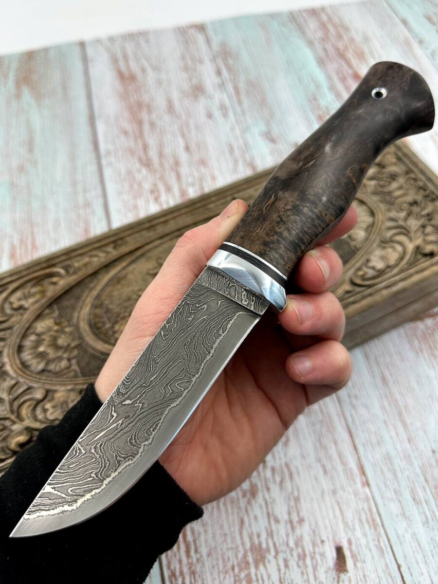 Рукоять на ноже выполнена из стабилизированной карельской березы коричневой.