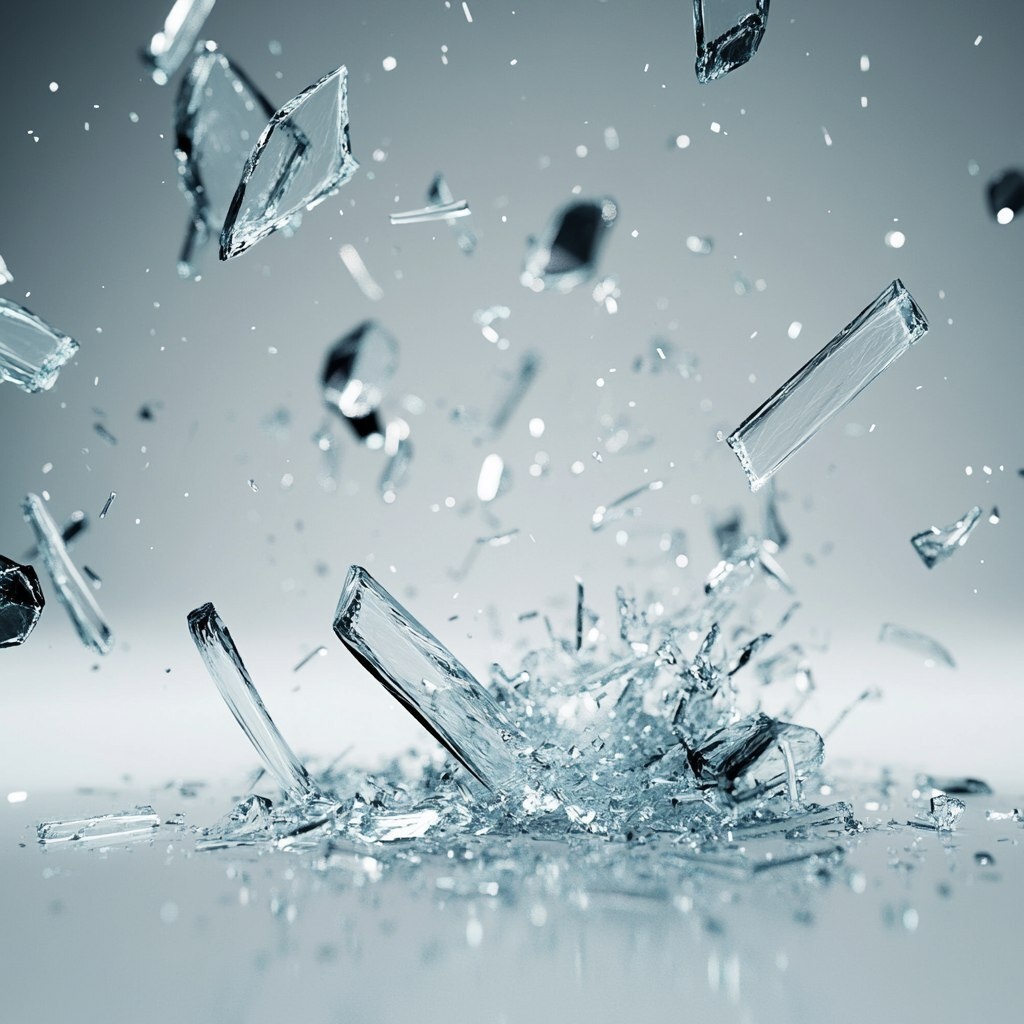 Создано на основе запроса: Thin shards of broken glass fly out with great force. Studio lighting on white background, shot from the front, natural light reflection, realistic object shadows, high resolution 8K, sharp focus.