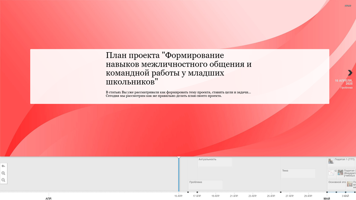 В статьях Вы уже рассматривали как формировать тему проекта, ставить цели и задачи... Сегодня мы рассмотрим как же правильно делать план своего проекта. Чтобы разобраться, поняли ли вы предыдущие статьи, в линии есть пропуски, которые Вам нужно заполнить. Ссылка на задание : https://udoba.org/node/206729 Вопросы-подсказки: 1. Какого числа была выпущена первая задача проекта? 2. Какое задание у первой задачи проекта? 3. Придумайте описание 2 подэтапа проекта.