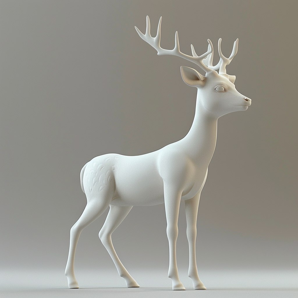 Создано на основе запроса: A 3D render of a young white deer fawn with spiral antlers, white background, standing, studio lighting