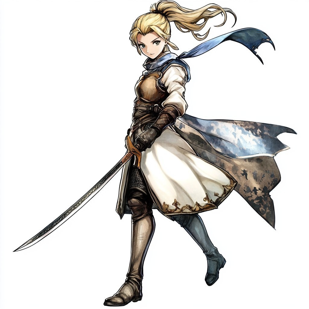 Создано на основе запроса: Fantasy concept illustration, Female, Elf, Warrior-Mage, Golden blonde hair, Golden eyes, Rapier of Light, Inscrutable, Elusive, Heavy leather armour, Octopath traveler style, White background, High quality, Exaggerated fighting pose --- Автоперевод: Фэнтезийная концепция иллюстрация, женщина, эльф, воин-маг, золотые светлые волосы, золотые глаза, рапира света, непостижимая, неуловимая, тяжелая кожаная броня, стиль осьминога, белый фон, высокое качество, преувеличенная боевая поза Хорошо выглядит? 🤔 https://dzen.ru/id/65c0c65c86e4f837c27b24d7 #ИИ #AI #нейросеть #midjourney #art