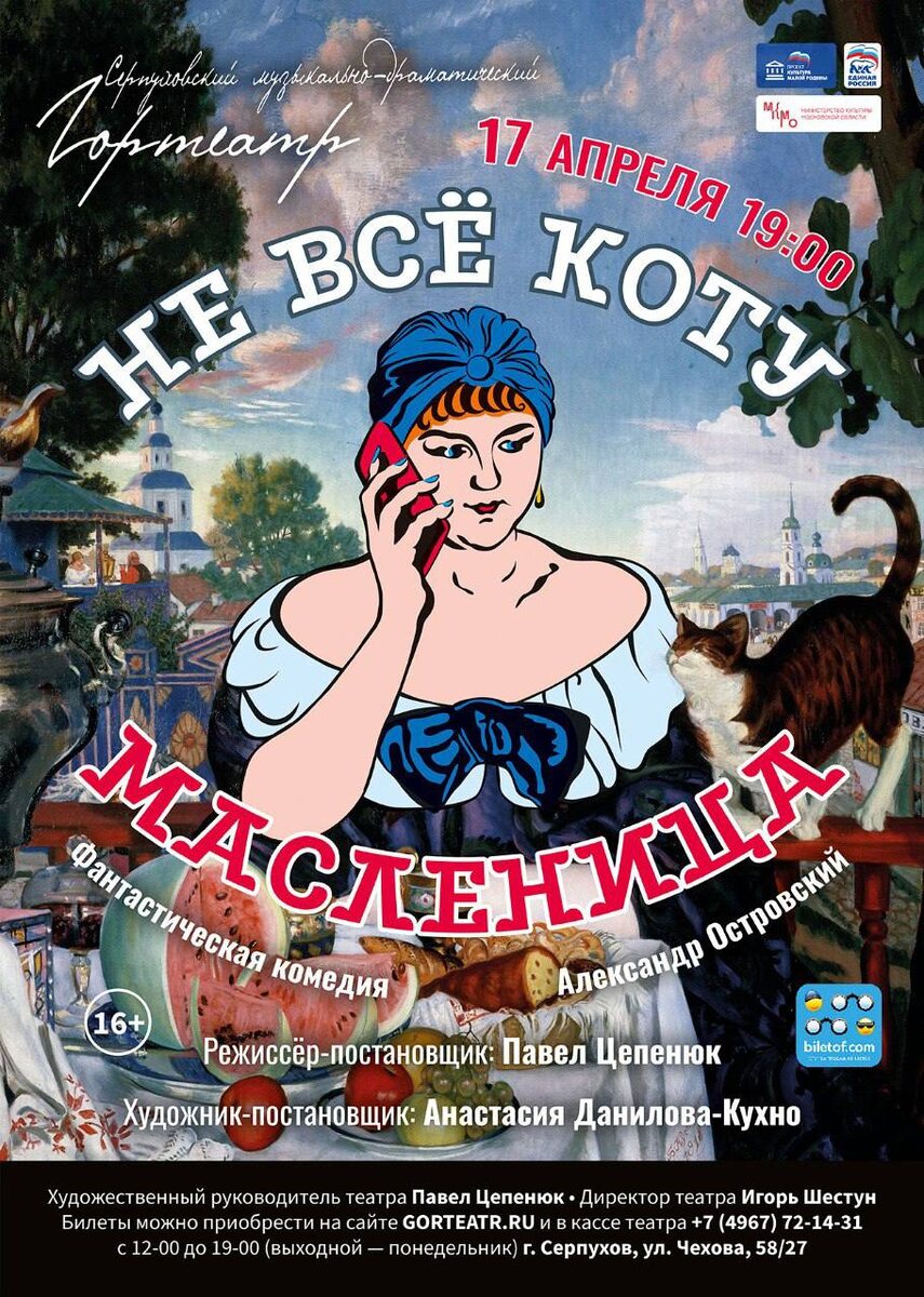 ✨ Спектакль НЕ ВСЁ КОТУ МАСЛЕНИЦА 🔍Фантастическая комедия в 2-х действиях (с антрактом) Режиссёр-постановщик – Павел Цепенюк Художник-постановщик – Анастасия Данилова-Кухно ⏳Продолжительность 2 ч. 20 мин. 🎟️https://new.biletof.com/choose/?ra=15782&elem=0&var=4&frame=1 Доступна оплата «Пушкинской картой» 🚫 Возраст: 16+ 📆 17.04.2025 🕒 19:00 🏢 Серпуховской музыкально-драматический Гортеатр 📍 г. Серпухов, ул. Чехова, д. 58/27 💰 Цена от: 200 до 600 ₽ #webСерпухов ✅ Мероприятия Серпухов https://dzen.ru/id/66f01c6eb4c6fe60c9ca1608 http://vk.com/serpukhov_events http://dzen.ru/serpukhov_events