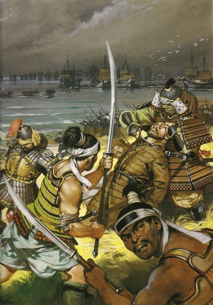 Всё семейство местного клана — свыше 80 всадников — погибло в самоубийственной контратаке на монголов в первой же битве на побережье Комода. Один из последних выживших самураев по имени Сукэсада отважился на героическую атаку в одиночку и в лихом порыве перебил 21 пешца и конного.