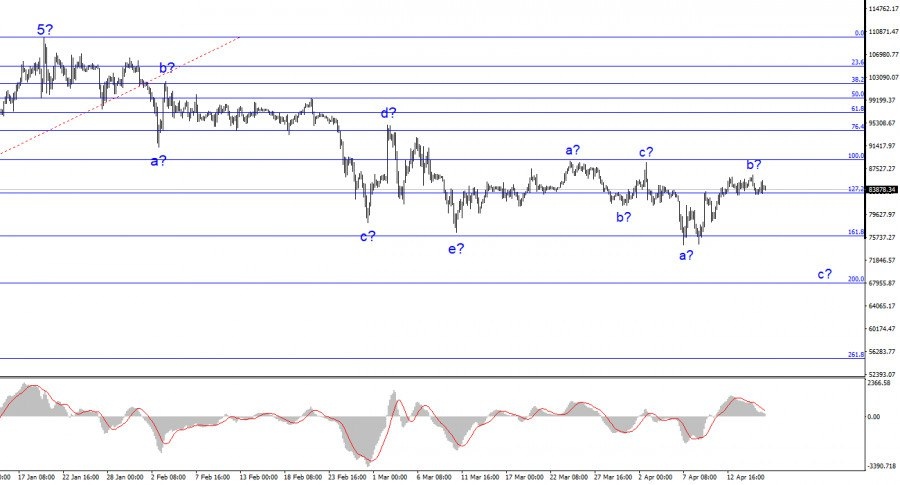 Волновая разметка 4-часового графика для инструмента BTC/USD выглядит абсолютно понятно. После завершения повышательного участка тренда, состоящего из пяти полноценных волн, началось построение понижательного участка, который на данный момент принимает коррекционный вид. Исходя из этого, я не ожидал и не ожидаю роста биткоина выше 110 000 – 115 000$ в ближайшие месяцы.