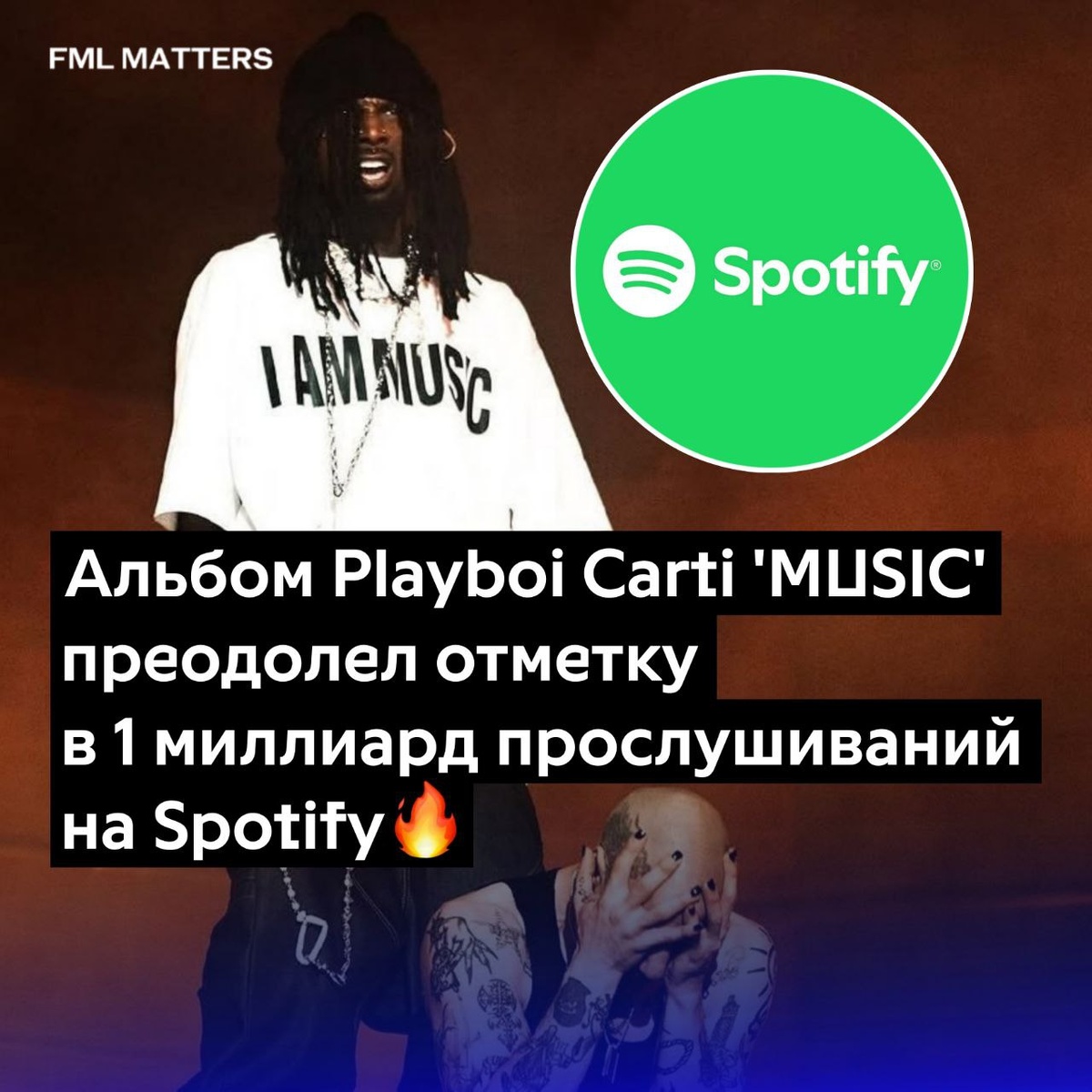 ❗️ «MUSIC» ОТ PLAYBOI CARTI ПРЕОДОЛЕЛ ОТМЕТКУ В 1 МИЛЛИАРД ПРОСЛУШИВАНИЙ! За месяц он стал самым быстро набравшим популярность рэп-альбомом 2025 года и самым быстрым альбомом Карти за всю его карьеру, достигшим таких цифр на Spotify. 💀 FML MATTERS