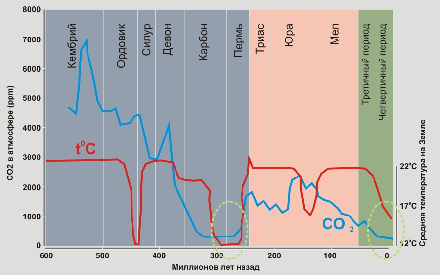 К возрасту эпох, когда произошли изменения концентрации СО2 на графике выше, можно относиться, как к событиям, но датировки, разумеется, могут быть условные. И если увеличение концентрации можно связать с масштабными выбросами газов из какого-то мощного извержения вулкана или одновременно из множества вулканов, то как быть с резким падением концентрации СО2?