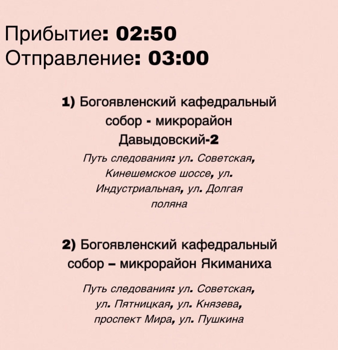 Пасха отмечается 20 апреля После окончания праздничного богослужения жители Костромы смогут добраться домой на автобусах. Транспорт будет следовать от Богоявленского собора Костромского кремля по двум маршрутам: до 2-го Давыдовского и Якиманихи. На всех попутных улицах автобусы также сделают остановку. Точный маршрут автобусов в Пасхальную ночь Пасхальный транспорт прибудет к недавно отреставрированному собору Костромского Кремля 20 апреля по окончании богослужения — в 02:50. Отправление произойдет в 3 часа ночи от улицы Чайковского, 10. Посадка будет производиться только у кремлевского собора, проезд для пассажиров бесплатный.