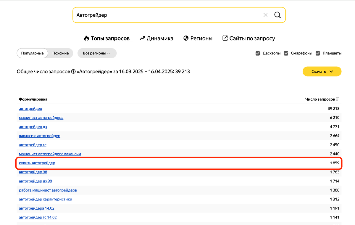 К счастью, интернет — это зеркало поведения наших покупателей. Он не отображает все аспекты человеческих отношений, но интерес к продукту и приоритеты аудитории — точно отражает. Один из самых действенных способов понять клиента — анализ ключевых запросов. В этой статье я покажу, как с помощью сервиса Яндекс.Вордстат можно выстроить полноценную маркетинговую стратегию для производственного бизнеса, на примере ниши строительной техники.