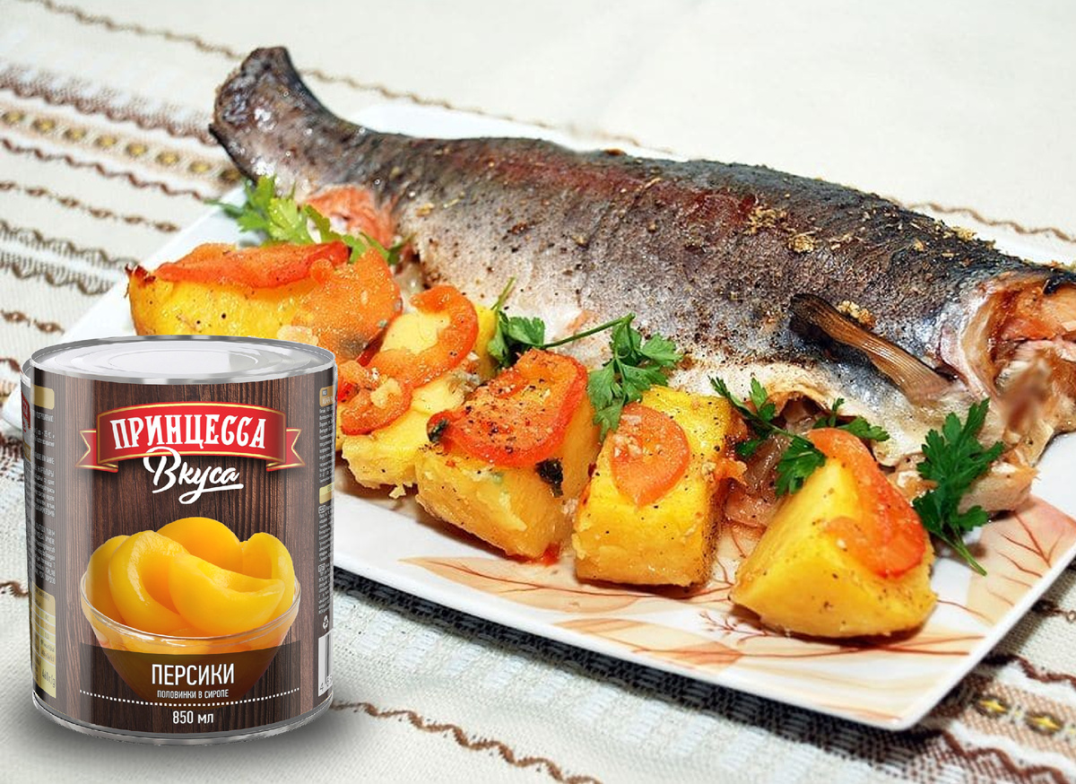 Отличный вариант лёгкого и сытного ужина без хлопот — филе форели с ломтиками персика, кабачка и картофеля, приготовленное на пару. Кисло-сладкий и сочный персик удачно дополняет рыбу, оттеняя её вкус нежными фруктовыми нотками, а гарнир из привычных овощей и зелени добавляет блюду питательности. Просто и вкусно. Ингредиенты: Филе форели - 250 г Персики - 110 г Кабачок - 130 г Картофель - 115 г Соль - по вкусу Перец чёрный молотый - по вкусу Листья салата - 2 шт. * (для подачи) Для маринования рыбы: Соль морская среднего помола - 1,5 чайной ложки Сахар - 1,5 чайной ложки Пошаговый рецепт Подготовьте продукты. Вымойте и обсушите картофель, кабачок и персик. Филе форели промойте и обсушите бумажным полотенцем. Для приготовления отдайте предпочтение плотным персикам, с твердоватой мякотью, так они сохранят форму после варки. (Готовить блюдо можно в пароварке, мультиварке в режиме "пароварка" или в кастрюле с крышкой, выложив продукты на специальную вставку для приготовления на пару. Если