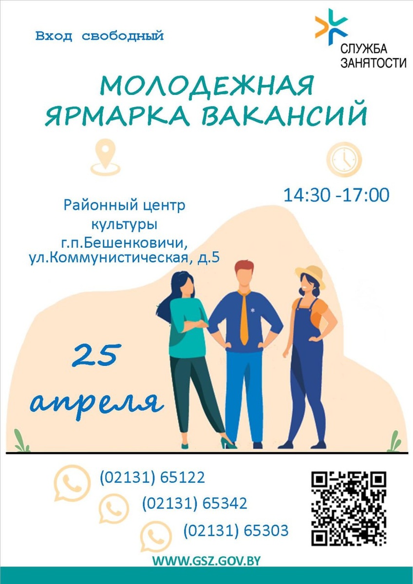 👫 Молодежная ярмарка вакансий пройдёт в Бешенковичском районе 25 апреля 📍 Место проведения мероприятия — районный центр культуры. 🕘 Время — с 14.30 до 17.00.