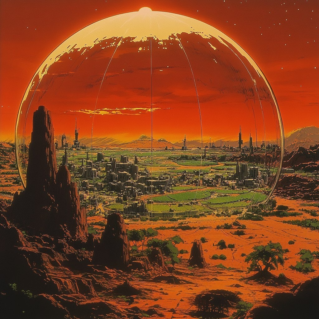 Создано на основе запроса: vintage science fiction anime still image, style of a hand-drawn 80s or 90s anime with dark bold lines. A settlement town with greenery beneath a gigantic glass dome, sheltering lush fields within from the harsh red desert outside the glass. The morning sun rises on the horizon, casting the harsh desert in a red-orange light. --- Автоперевод: Винтажное научное фантастическое аниме все еще изображение, стиль нарисованного вручную аниме 80-х или 90-х годов с темными жирными линиями. Интересно получилось? 🤔 https://dzen.ru/id/65c0c65c86e4f837c27b24d7 #ИИ #AI #нейросеть #midjourney #art