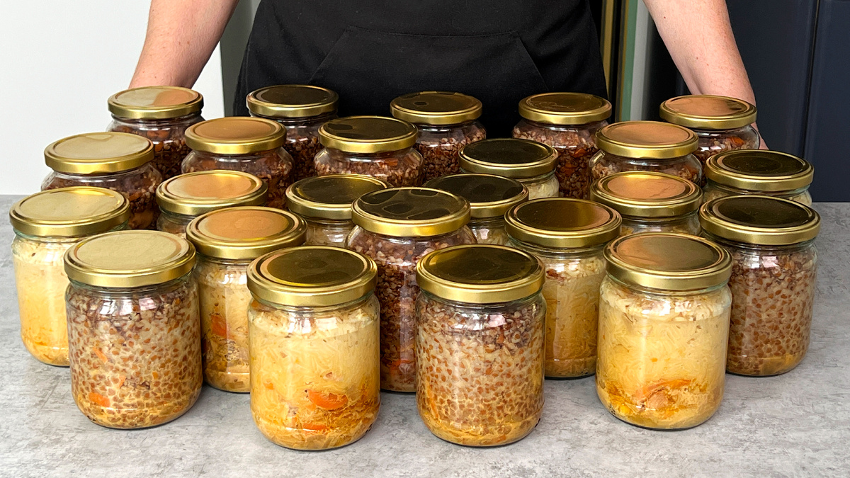 К даче готова! Как раз и погода у нас налаживается, выходные обещают вообще по летнему тепло до + 22 градусов. Я уже много лет делаю такую заготовку весной, она меня очень выручает, особенно на даче весной, когда совсем нет времени на готовку. А тут открыл баночку, разогрел и обед или ужин готов - это очень удобно. Начну с самого простого и самого удобного рецепта для меня. В миску высыпаю гречневую крупу. Наливаю воду, добавляю соль и довожу до кипения, соль должна полностью раствориться. Снимаю с огня и заливаю гречку. Накрываю крышкой и оставлю гречку на столе набухать. Разогреваю сковородку, добавляю растительное масло и обжариваю лук. Когда лук станет мягким, добавляю нарезанную морковь и жарю еще буквально несколько минут. Зажарка готова, перекладываю в гречку и оставляю еще постоять, так гречка пропитается ароматами овощей. Куриное филе нарезаю небольшими кусочками, так будет потом удобнее есть. У меня здесь чуть больше килограмма филе бедра. Перекладываю в миску и добавляю соль