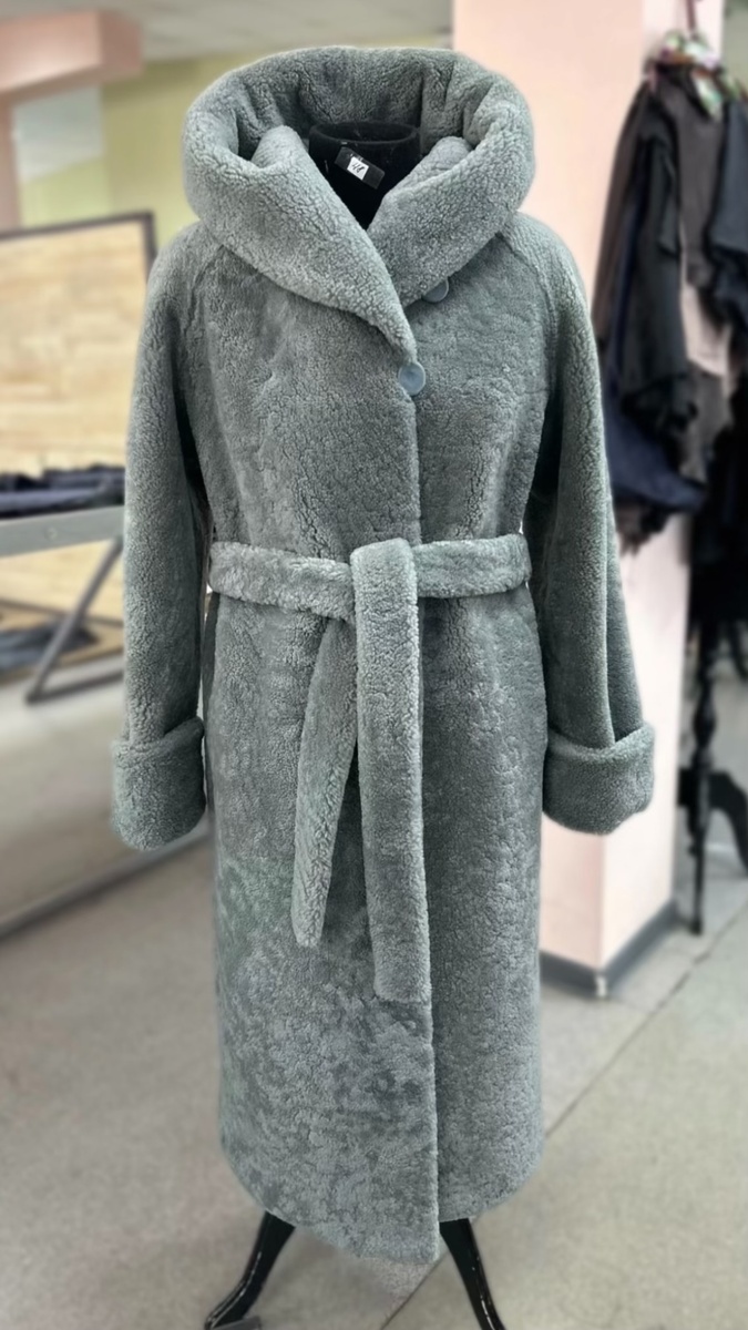 Лот #1. Шуба из овчины керли в приятном мятном оттенке арт. 1494. Пальто прямого силуэта с застёжкой на 2 навесные петли и пуговицы и 5 шубных крючков, с рукавами реглан и двусторонним капюшоном с отворотом. На полочках обработаны боковые прорезные карманы. По линии талии - меховой пояс с завязывающимися концами. По индивидуальному запросу заказчика были внесены следующие изменения ( в отличие от классической модели арт. 1494 с нашего сайта): капюшон сделали с отворотом на углубленной горловине, а по низу рукавов - отгибающиеся манжеты, также была изменена линия входа в карман. Пальто из керли арт. 1494 было изготовлено по индивидуальным меркам заказчицы.