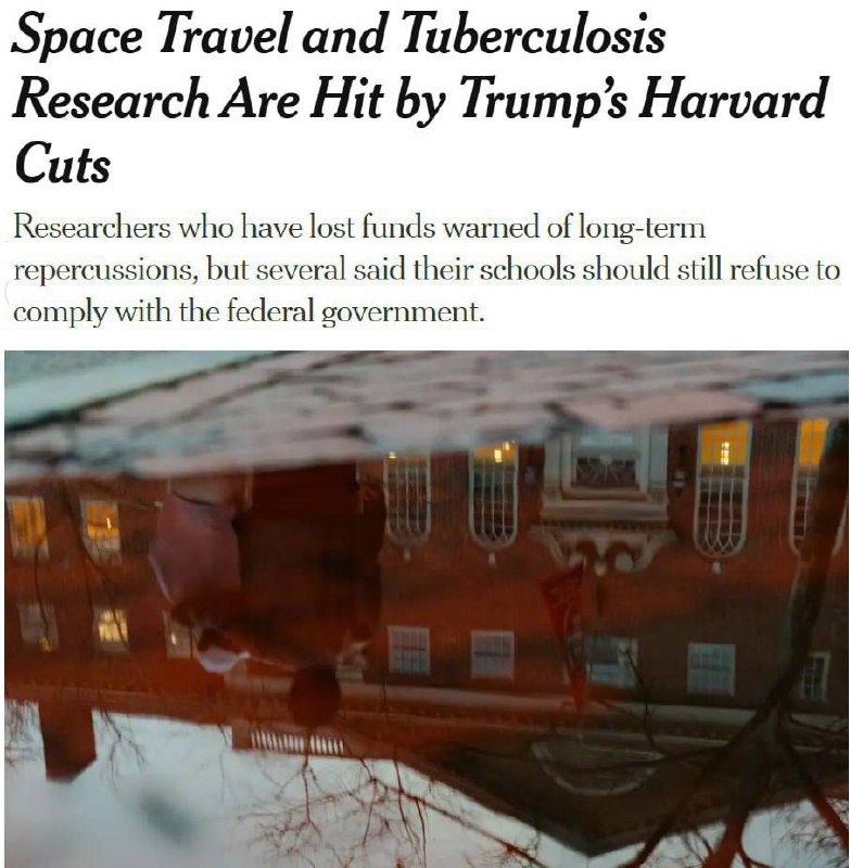 Учёные в Гарварде приостанавливают исследование космических полётов и туберкулёза, пишет NYT. Они получили уведомление о необходимости «прекратить работу» после решения Белого дома заморозить финансирование университета на $2,2 млрд (1,8 трлн рублей). Ранее президент Гарварда заявлял, что заведение не будет принимать требования Трампа и менять свою политику защиты студентов еврейского происхождения от акций протеста. 🟩 Подписаться | Прислать новость | Читать аналитику