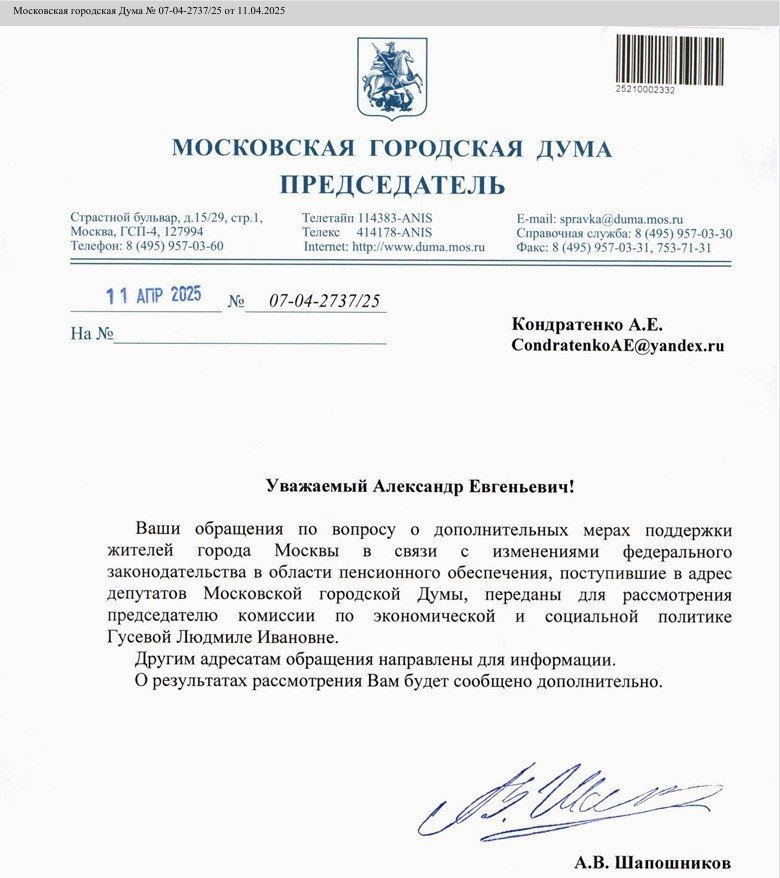 Из всех обращений депутатам МГД … Для выполнения вышеупомянутого условия, обозначенного Владимиром Владимировичем Путиным, ПРОШУ ВНЕСТИ НА РАССМОТРЕНИЕ МГД следующую ЗАКОНОДАТЕЛЬНУЮ ИНИЦИАТИВУ о внесении изменений в Закон города Москвы № 19 от 26.09.2018 «О дополнительных мерах поддержки жителей города Москвы в связи с изменениями федерального законодательства в области пенсионного обеспечения» … пока пришло только два прилагаемых ответа. Председатель МГД Алексей Валерьевич Шапошников (ЕР) перенаправил обращение Людмиле Ивановне Гусевой, сказать спасибо которой за гармонизацию предпенсионеров можно здесь https://t.me/guseva33/4195. Руководитель фракции КПРФ в МГД Николай Григорьевич Зубрилин обращение принял к сведению для использования в дальнейшей работе.