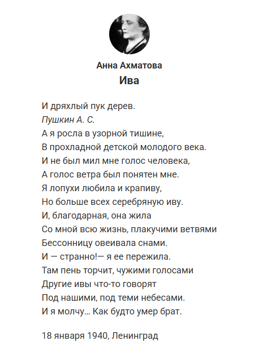 Разберём на примере ивы. Ива — растение лирическое. Она вдохновляет на разные образы, присутствует в стихотворениях, прозе, песнях, устойчивых выражениях. Это узнаваемый поэтический образ в русской культуре. Взрослый образованный человек чаще всего найдёт ту или иную ассоциацию с этим деревом.