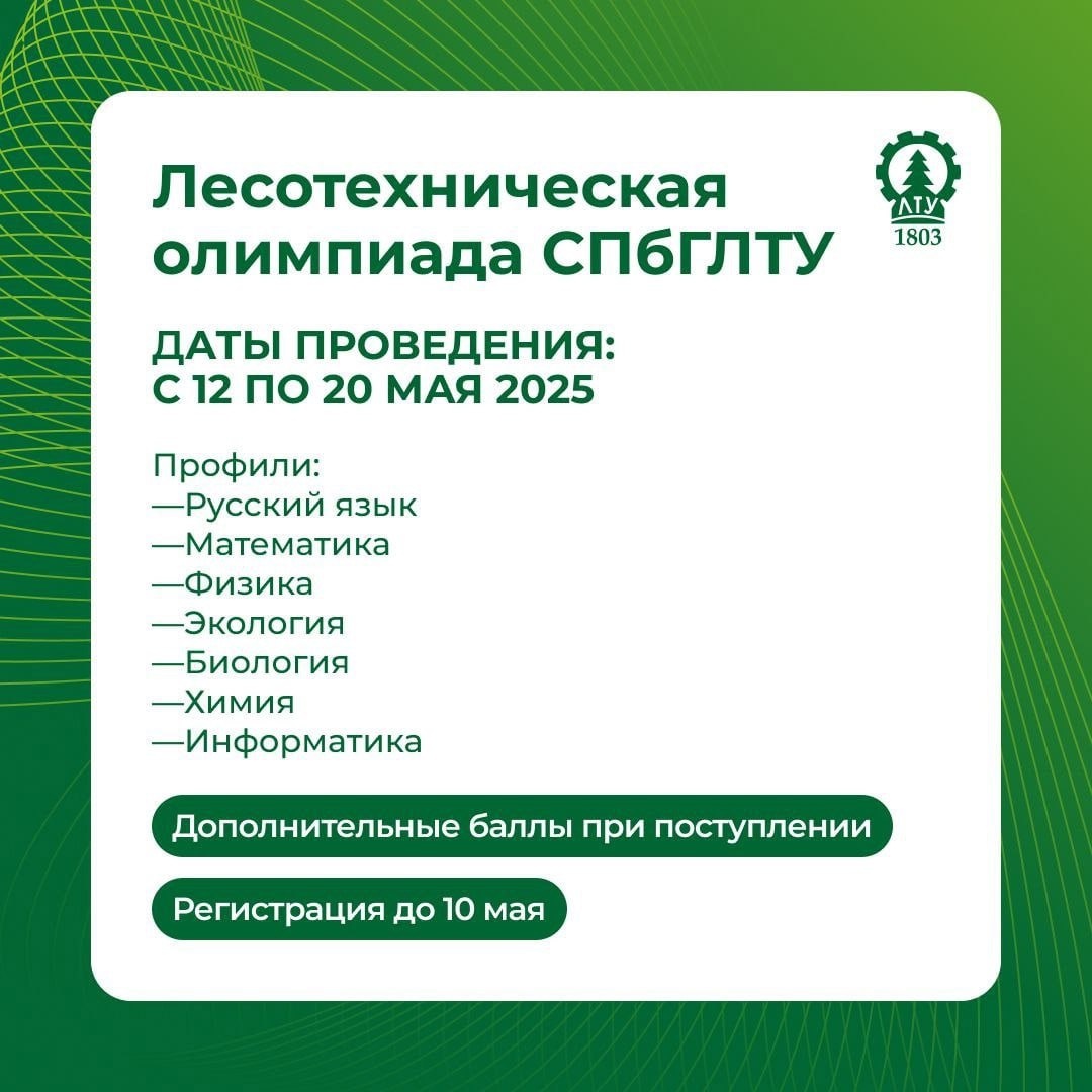 ✨ Лесотехническая олимпиада СПбГЛТУ ✨ 🔈 Дорогие абитуриенты, предлагаем вам принять участие в Лесотехнической олимпиаде СПбГЛТУ. 📌 Олимпиада проводится в один этап в очной форме в период с 12 мая 2025 года по 20 мая 2025 года. 📍Место проведения Олимпиады: г. Санкт-Петербург Институтский пер. дом 5 литер У, главное здание, 2 учебный корпус. 🏆 Результаты олимпиады — не позднее 23 мая 2025 года. ✅ Результаты олимпиады учитываются при поступлении на программы. бакалавриата СПбГЛТУ как общие индивидуальные достижения: • Диплом I степени — 10 баллов • Диплом II степени — 9 баллов • Диплом III степени — 8 баллов • Сертификат участника — 3 балла ❗️Ссылка на регистрацию. Срок подачи заявки на участие в Олимпиаде до 10 мая 2025 года включительно. Регламент о проведении «Лесотехнической олимпиады» и согласие на обработку персональных данных можно найти на сайте Университета 👀