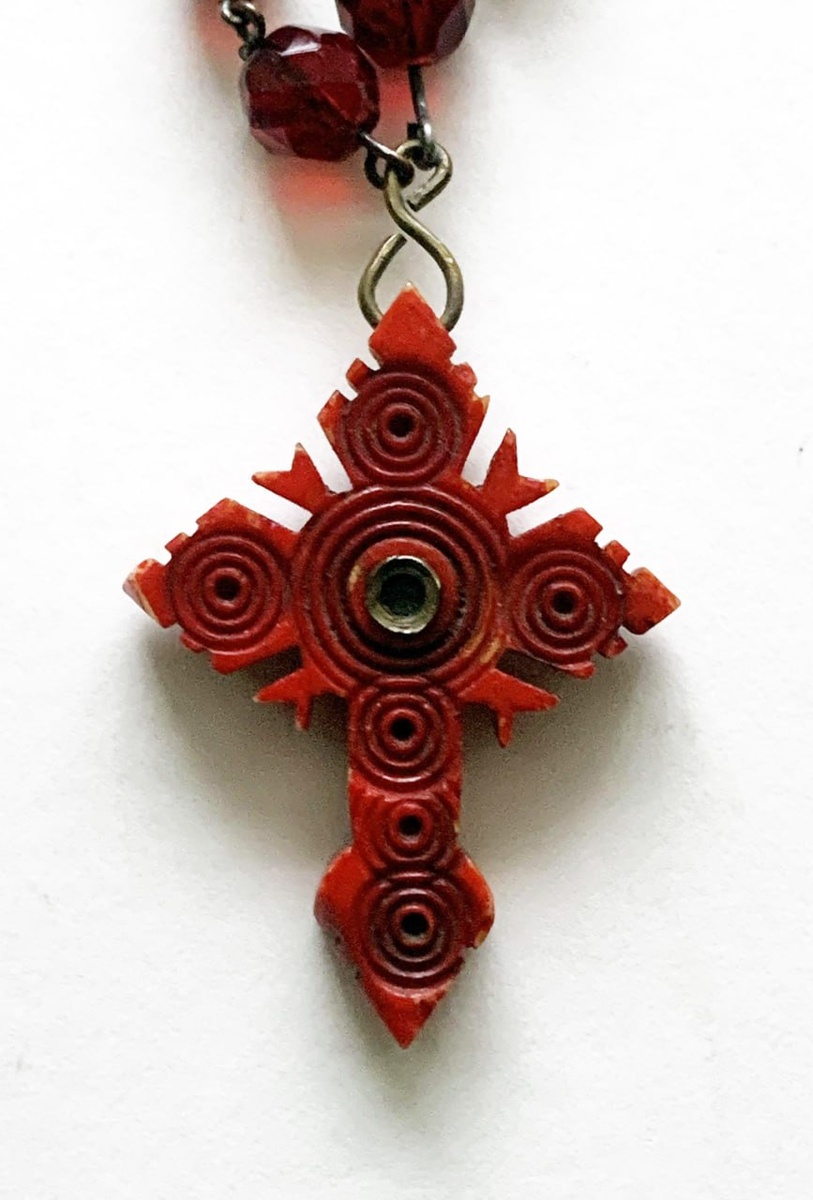 Четки с секретом Среди последних поступлений, представленных на выставке «ТОП 100+5», можно увидеть переборные православные четки второй половины XIX века. Они составлены из 57-ми стеклянных темно-красных бусин и завершены четырехконечным фигурным, резным из кости, маленьким крестом. Примечательны четки тем, что в таком, казалось бы привычном предмете личного благочестия, выполненном из вполне традиционных материалов, можно увидеть результаты научно-технических достижений XIX века. В центре креста помещена круглая латунная вставка с увеличительным стеклом, которое называется «линза Стэнхоупа». В линзе, если посмотреть в неё одним глазом, видна микрофотография с черно-белым изображением печатной страницы из неизвестного издания, вероятно, Киево-Печерского патерика. В центре композиции — Успенский собор Лавры в окружении святых монахов и священнослужителей. Над ними в облаках парят два ангела, поддерживающие икону Успения Пресвятой Богородицы. Внизу подпись: «Собор святых Киево // Пече