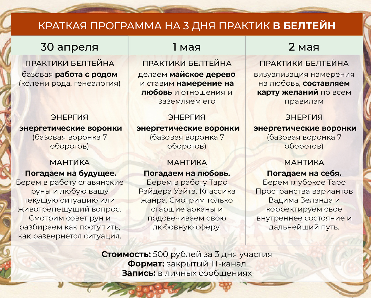 🔆 У нас скоро мини-группа на 3 дня - 30 апреля, 1 и 2 мая, это одна из силовых точек года, Белтейн. День пиковой энергии, классной, женской, очень мощной, нельзя пропускать такой день! ❤️🔥 Что такое Белтейн? Праздник колеса года, лето входит в свои права. День женских практик, пробуждения природы и обретения силы. Практики Белтейна: всё, что касается женской энергии, ставим намерение на любовь и отношения, визуализируем, делаем карту желаний по всем правилам, заземляем намерение практикой «Майское дерево». Всё этом будем делать в группе вместе 3 дня📍 ❣️Ещё возьмем в работу энергетические воронки, научимся их крутить, разгоним энергию, включим женскую силу Также этот день - самый сильный в году для мантики❗️, все гадания идут на ура, особенно на отношения, на мужчин, на будущее. Я возьму свою классику - таро Райдера Уэйта, таро Зеланда и славянские руны. ♨️ Руны возьмем в первый день, это мой любимый инструмент, сложный, с характером, рунические расклады и ставы у меня самые дорогие