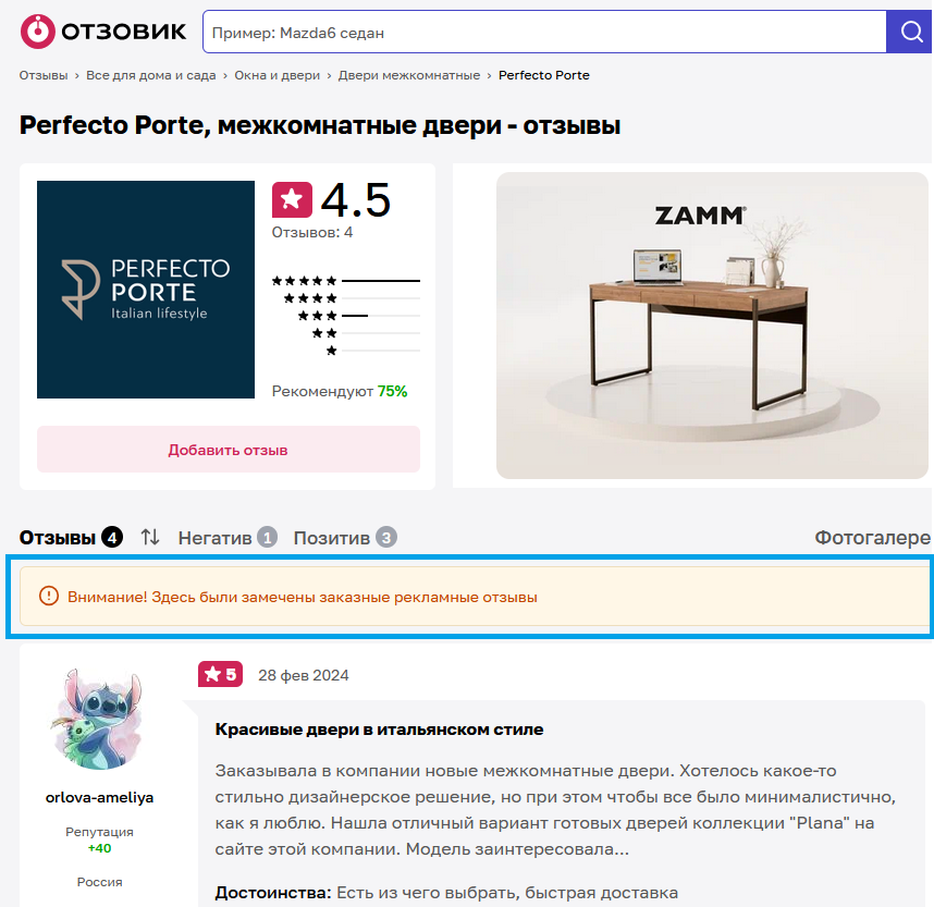 Ну и еще один момент, про который не могу промолчать. Я открыла сайт отзовик, чтобы посмотреть что вообще пишут про Perfecto Porte, какие есть отзывы на эту компанию. Так отзовик предупреждает, что были замечены заказные рекламные отзывы. Поэтому 3 хороших отзыва - это хорошо, но встает вопрос есть ли среди них хотя бы один настоящий.