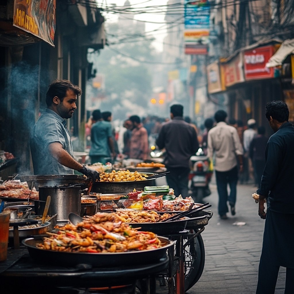 Создано на основе запроса: a chaotic perspective of Delhi India street food and people everywhere and rickshaws